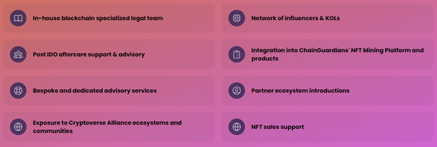 The other critical component of a launchpad incubator for it to legitimately work to optimize a startup projects’ pre-IDO fundraising, market launch, and its ongoing success within the marketplace, is to have both scalable and secure smart contract functionalities. Smart contracts govern all logic on a web 3.0 blockchain, and therefore the ChainBoost ecosystem operates solely by the automated order of pre-set smart contracts. Therefore, the extent to which ChainBoost can provide personalized optimization to startup projects is predicated on ChainBoost’s smart contract functionality. Check out our full arsenal of perks for our boosted projects in the graphic below.
